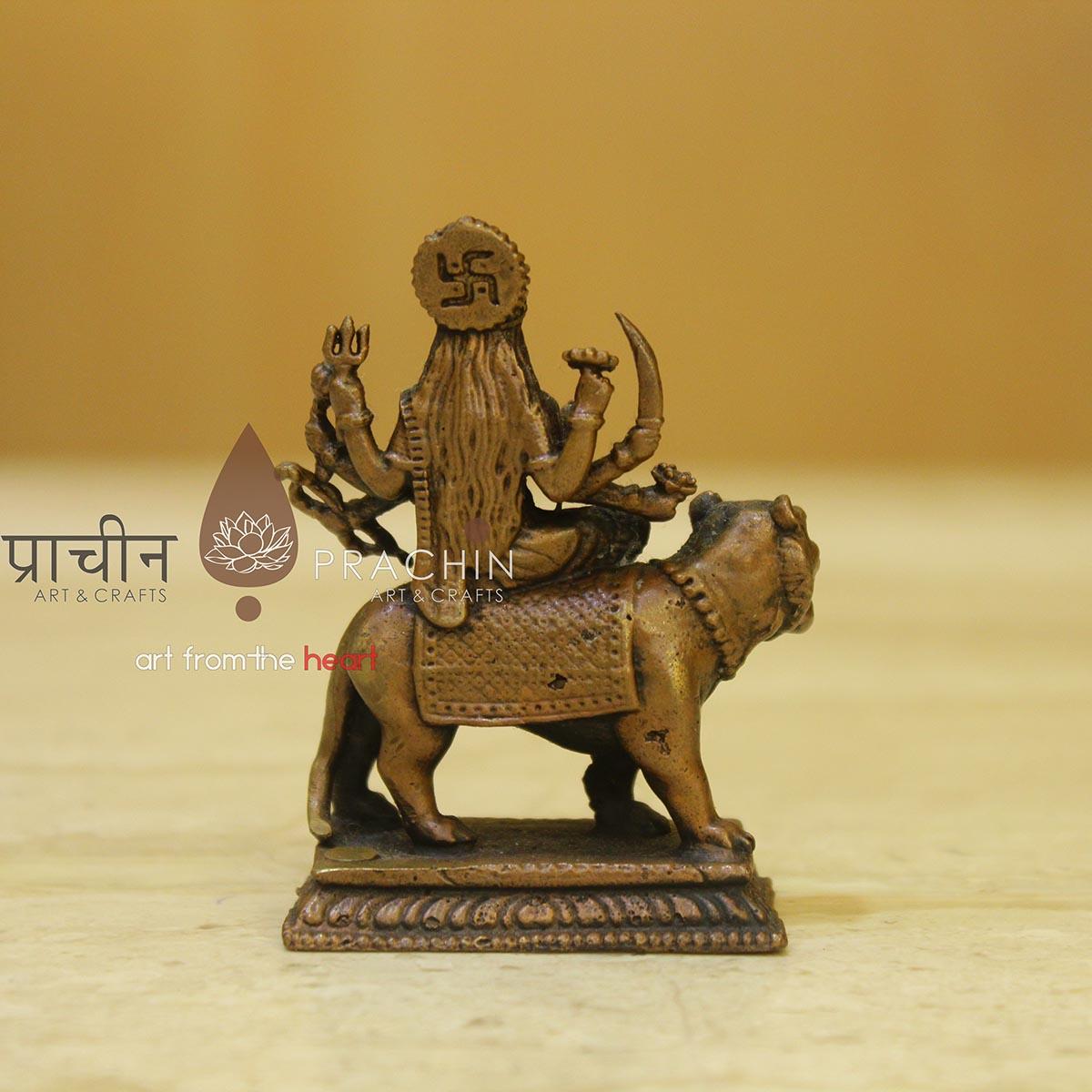 Copper Durgamaa Idol. In Hinduism, the goddess Durga, also known as Shakti or Devi, is the protective mother of the universe. She is one of the faith's most popular deities, a protector of all that is good and harmonious in the world. Sitting astride a lion or tiger, the multi-limbed Durga battles the forces of evil in the world.